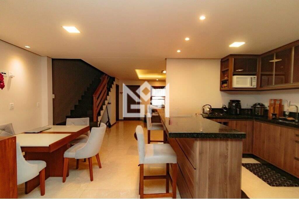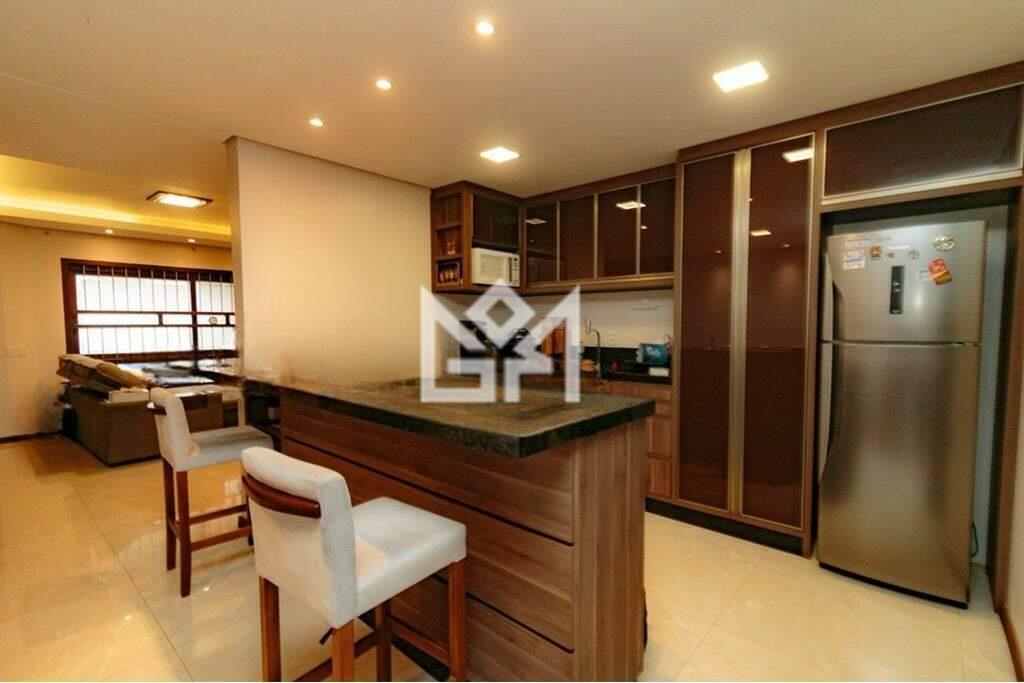 Logo na entrada, a casa apresenta uma ampla sala de estar com lareira, teto rebaixado em gesso com iluminação em LED e acabamentos em porcelanato, criando um ambiente elegante e acolhedor. A cozinha planejada, com armários sob medida e bancada em granito, integra-se à área de jantar, perfeita para o dia a dia e ocasiões especiais.
