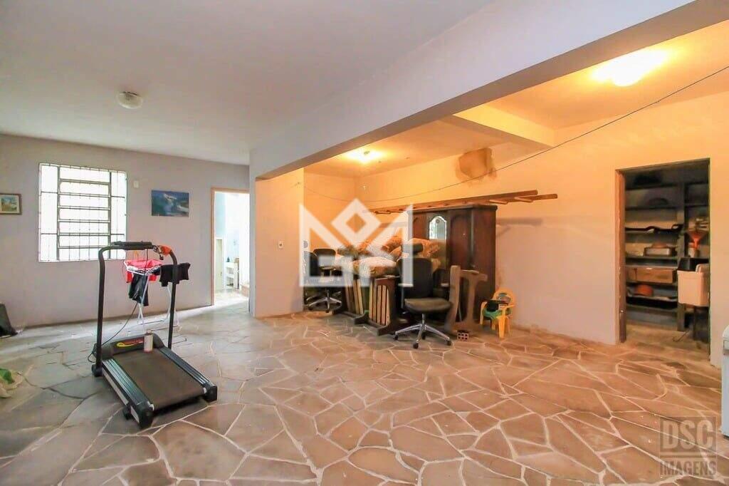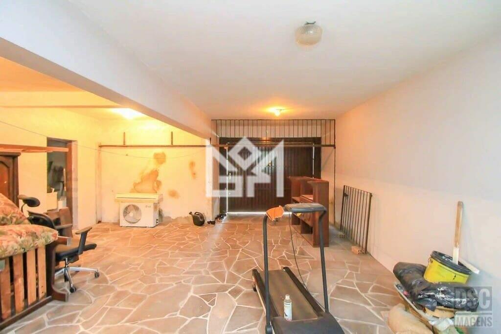 O pavimento inferior (subsolo), acessível tanto internamente quanto de forma independente pela rua (garagem ou acesso lateral), oferece garagem fechada para até 4 veículos, depósito, segunda cozinha com copa, estar íntimo, 1 dormitório e acesso direto ao amplo pátio nos fundos, ampliando ainda mais o potencial do imóvel para diferentes usos.
