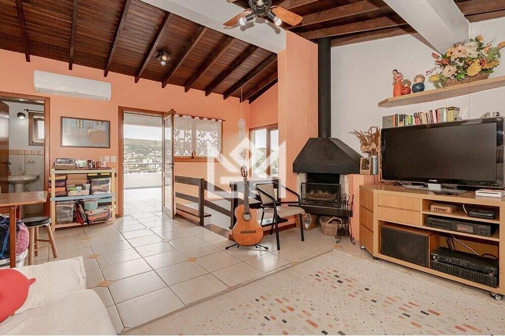 O living para dois ambientes oferece espaço e aconchego, com lareira que valoriza ainda mais o ambiente social. A residência possui cozinha funcional, churrasqueira, pequeno pátio privativo ideal para horta ou jardinagem, além de terraço com uma vista encantadora, perfeito para momentos de descanso e contemplação da paisagem natural do bairro.