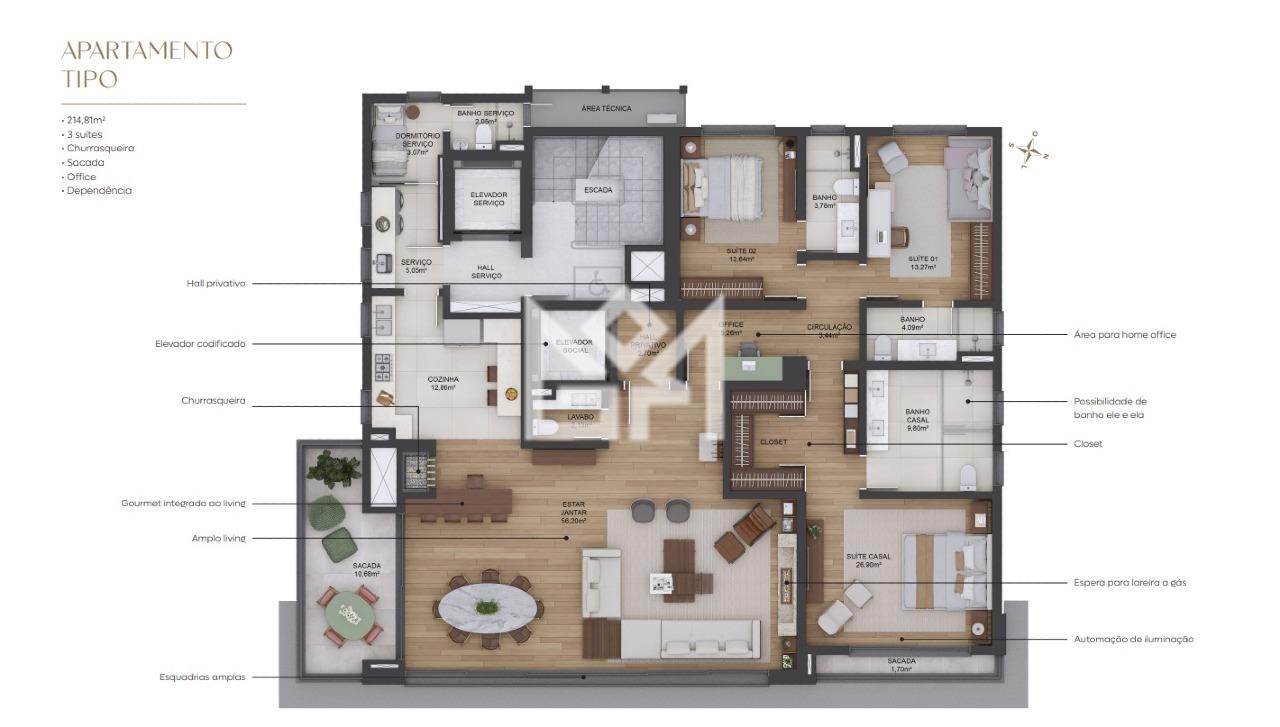 A cobertura conta com três suítes, quatro banheiros, duas varandas e área social generosa, ideal para receber convidados e aproveitar momentos em família. O projeto privilegia iluminação natural e integração entre os espaços, criando ambientes elegantes e funcionais.
