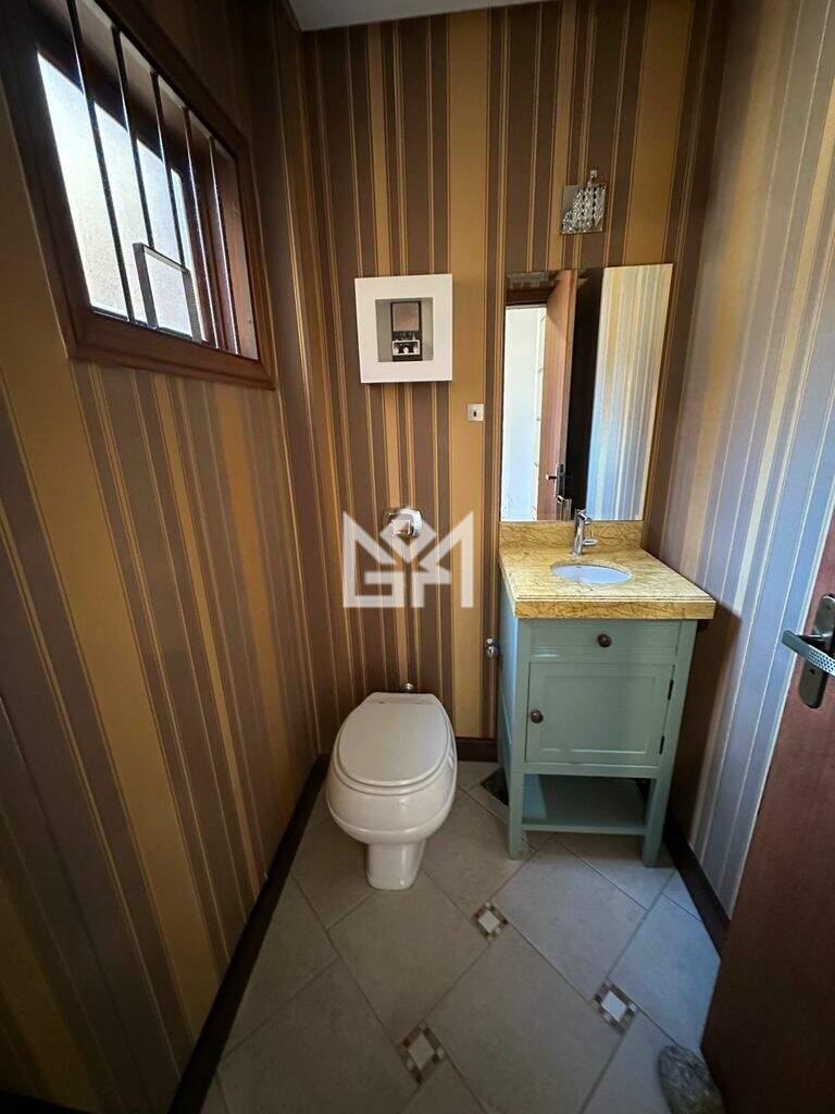 O segundo pavimento abriga a área social, com living amplo para três ambientes, lareira, lavabo, sala de jantar com sacada e churrasqueira, além de cozinha funcional e lavanderia independente. Os ambientes são bem iluminados e integrados, garantindo praticidade no dia a dia.