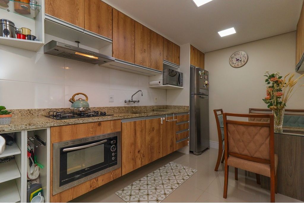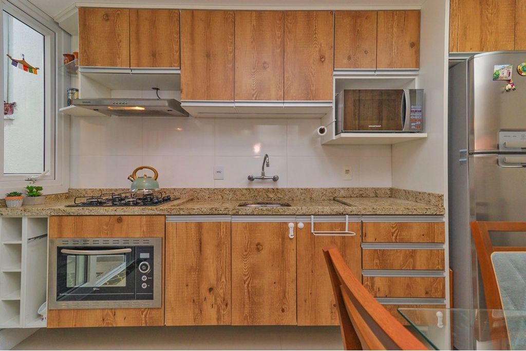 Cozinha com armários sob medida, cooktop e forno