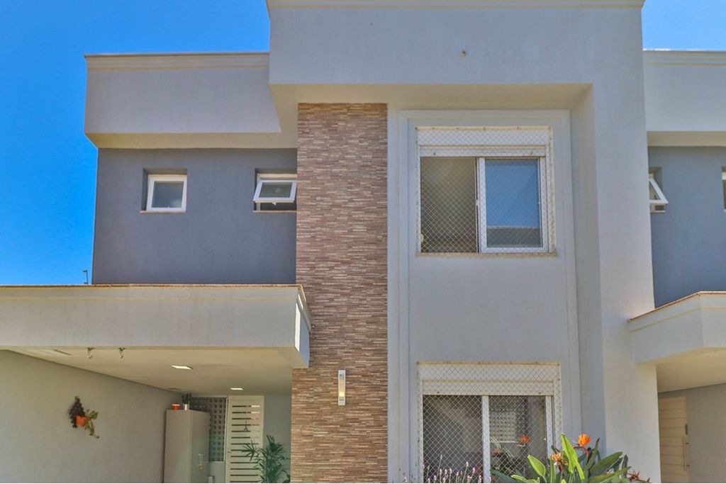 No pavimento térreo, a casa oferece sala ampla com lareira convencional, painel de televisão sob medida, lavabo e ar-condicionado. A cozinha com armários sob medida, de ótimo padrão, conta com cooktop e forno, integrando-se ao espaço gourmet com churrasqueira tradicional. A cobertura em vidro com acionamento automatizado agrega conforto e funcionalidade ao ambiente.
